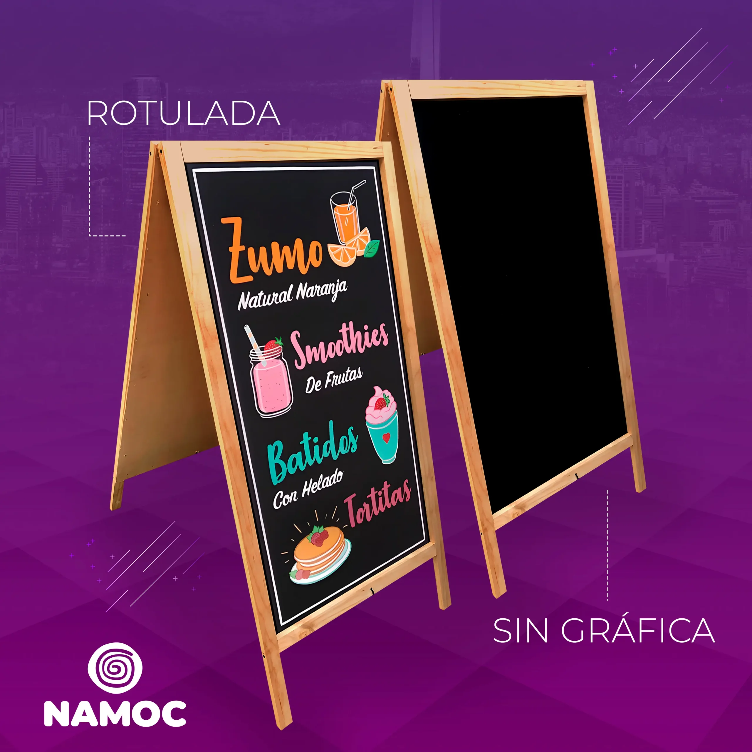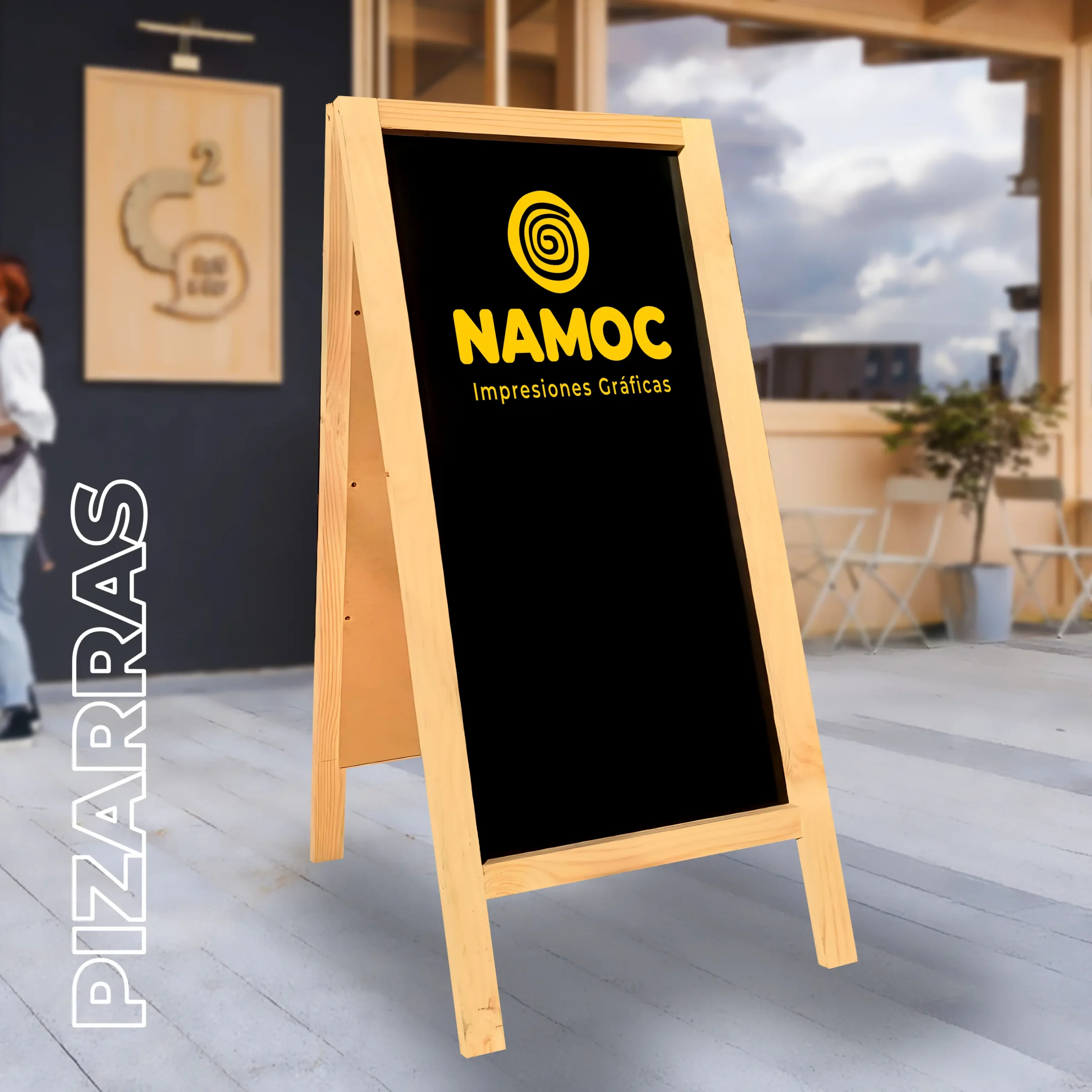 Destaca tu negocio con nuestras pizarras personalizadas. En Namoc fabricamos pizarras ideales para restaurantes, cafés, tiendas o ferias, con opciones de superficie para tiza o gráfica rotulada con vinilo. Puedes elegir entre estilos permanentes o reutilizables, permitiendo cambiar tus mensajes con facilidad y mantener siempre una imagen actualizada y profesional.